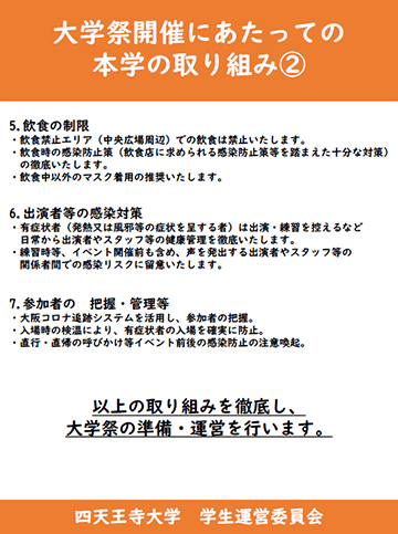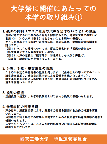 準備および大学祭当日は、下記の通り、 「大学祭開催にあたっての本学の取り組み」を策定・遵守した上で、準備・運営いたします。