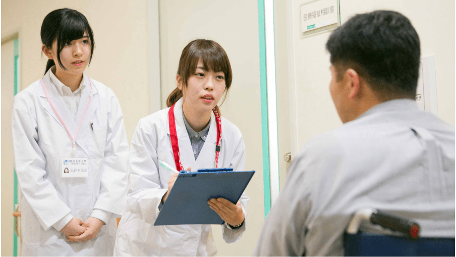 メディカルソーシャルワーカー(MSW)をめざす学生のために、4年次に病院でのインターンシップを実施しています。学生は、MSWの業務内容、医療・介護保険制度、医療従事者の接遇マナーなどを学んだ後、約2週間病院に配属され、ベテランMSWの指導のもと、患者の支援や退院調整、チーム医療に参加します。この経験を通じ、多くの学生が卒業後、病院のMSWとして活躍し、患者の生活と療養をサポートしています。