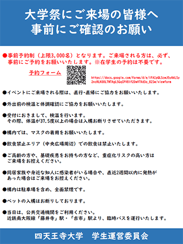 ご来場をいただく前に、必ず、下記の「大学祭へご来場の皆様へ」をご確認いただき、感染症対策にご協力をいただきますよう、宜しくお願い申し上げます。