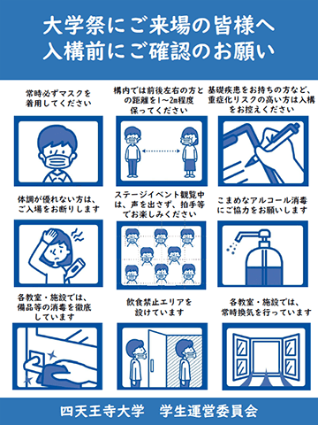 準備および大学祭当日は、下記の通り、 「大学祭開催にあたっての本学の取り組み」を策定・遵守した上で、準備・運営いたします。