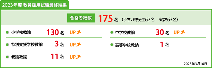 小学校教論130名をはじめ、多数の合格者を輩出しました。