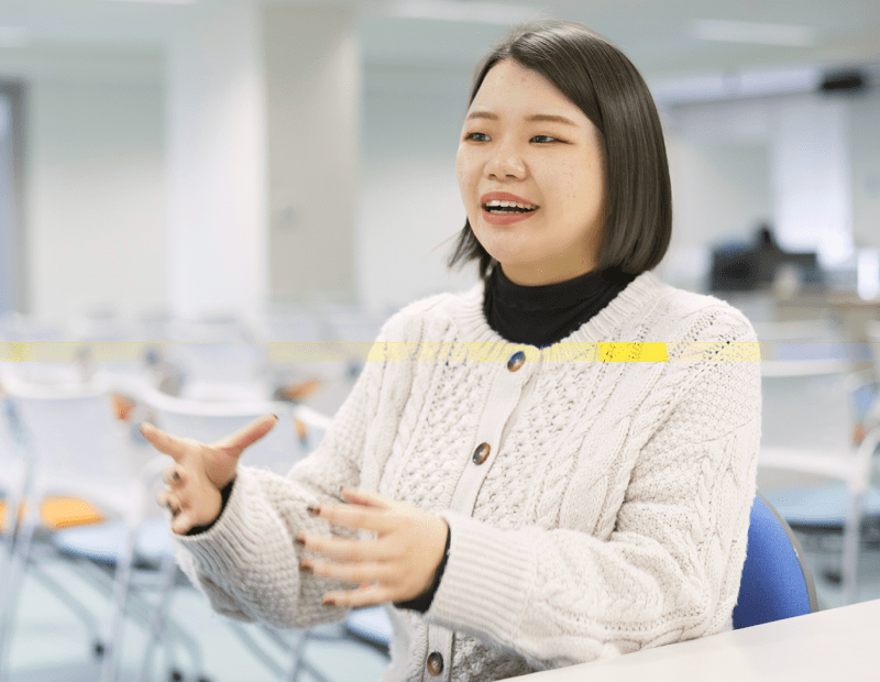 高校生のときに参加した海外でのホームステイで「日本語」の授業に興味を持ち、日本語教員をめざすうえで、海外と比較しながら自国のことをもっと深く理解できる日本学科を選びました。「日本語学」の授業では日本語の複雑な構造を実感し、「現代文化」の授業ではアニメやマンガの成り立ちを学ぶことで日本と海外の表現の違いを知ることができ、自国の理解につながりました。