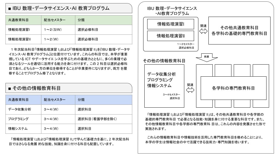 プログラムを構成する全学共通の共通教育科目「情報処理演習Ⅰ」(2単位)および「情報処理演習Ⅱ」(2単位)の合計4単位を修得する修得することが要件で、以下を開設しています。