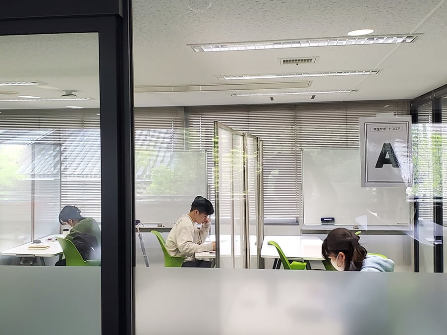 3号館(図書館)2階にある学生サポートフロアは、講義の受講や提出課題の作成など学習に困難を感じる学生が主体的に学べるためのサポートが受けられる場所です。